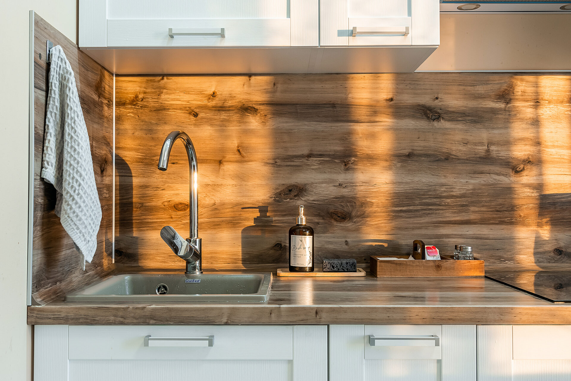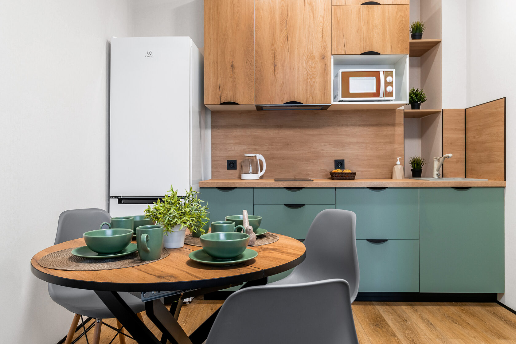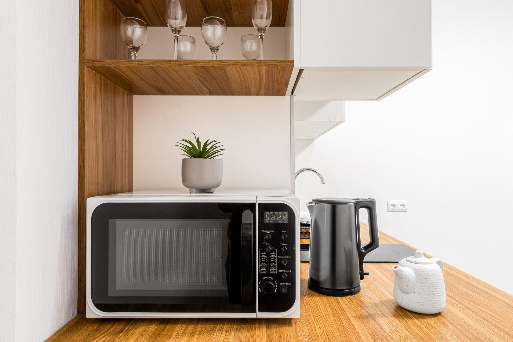 Полностью оборудованная кухня (холодильник, индукционная плита, СВЧ-печь, чайник, фильтр-кувшин для воды, набор посуды);