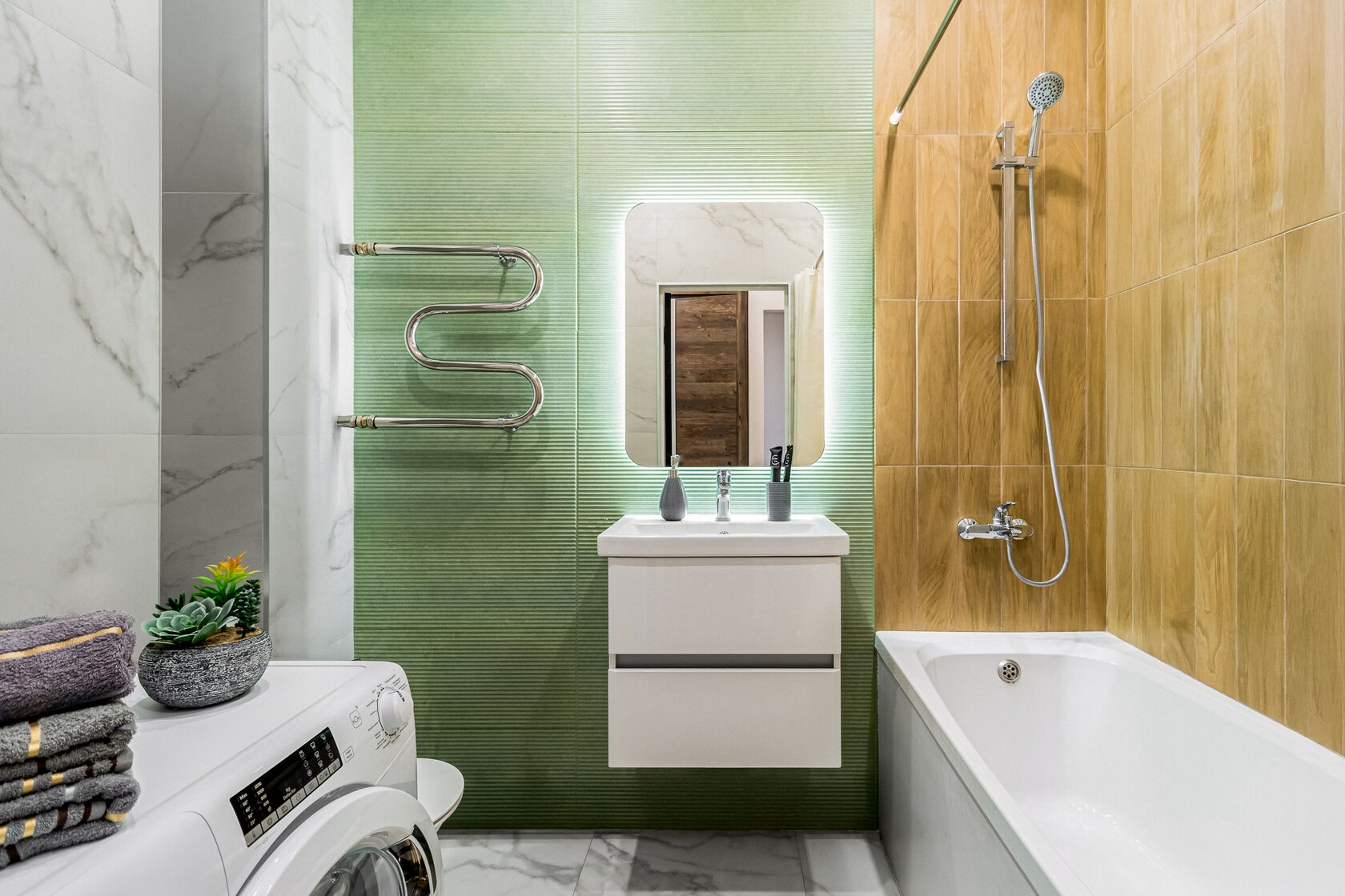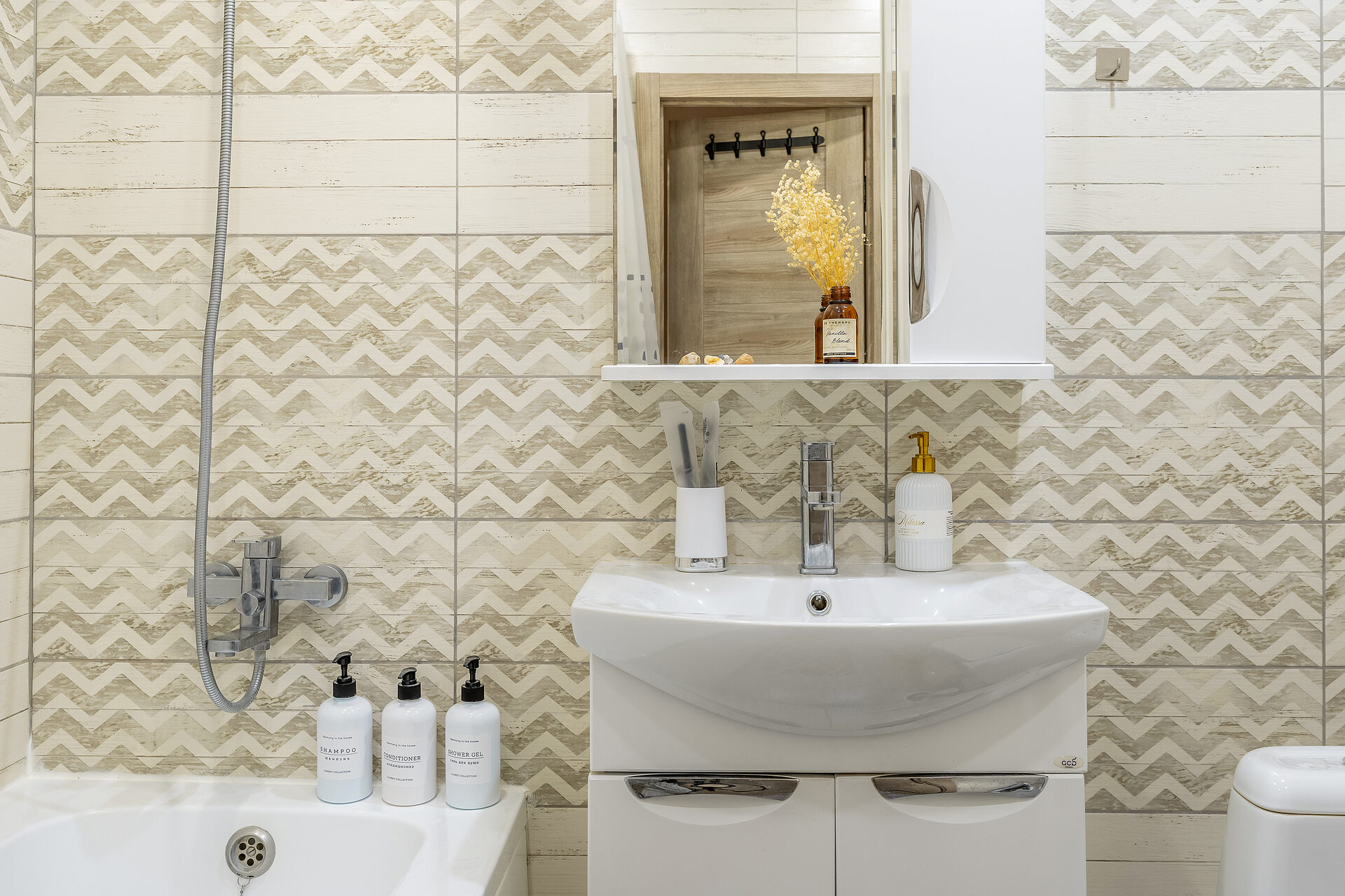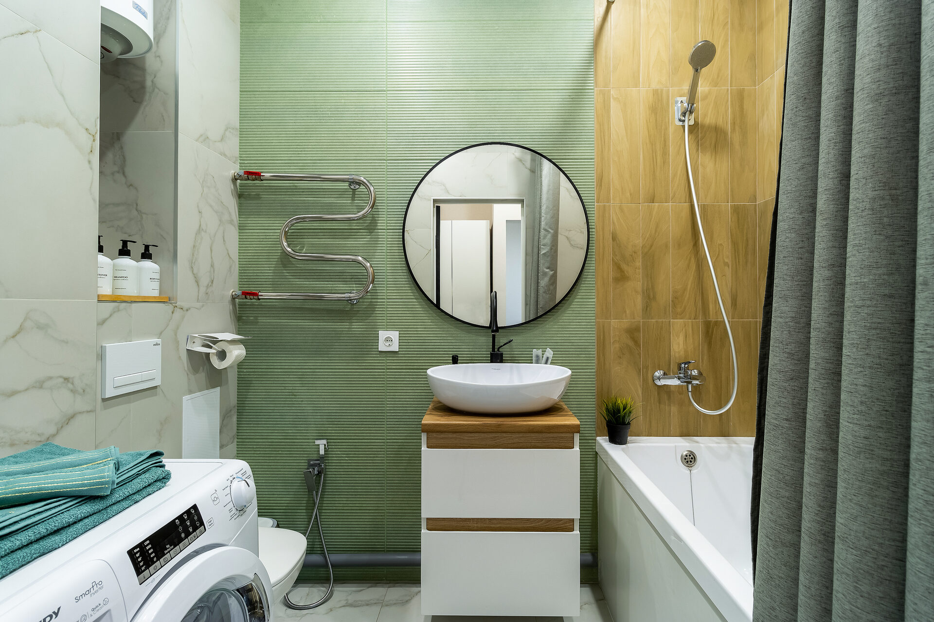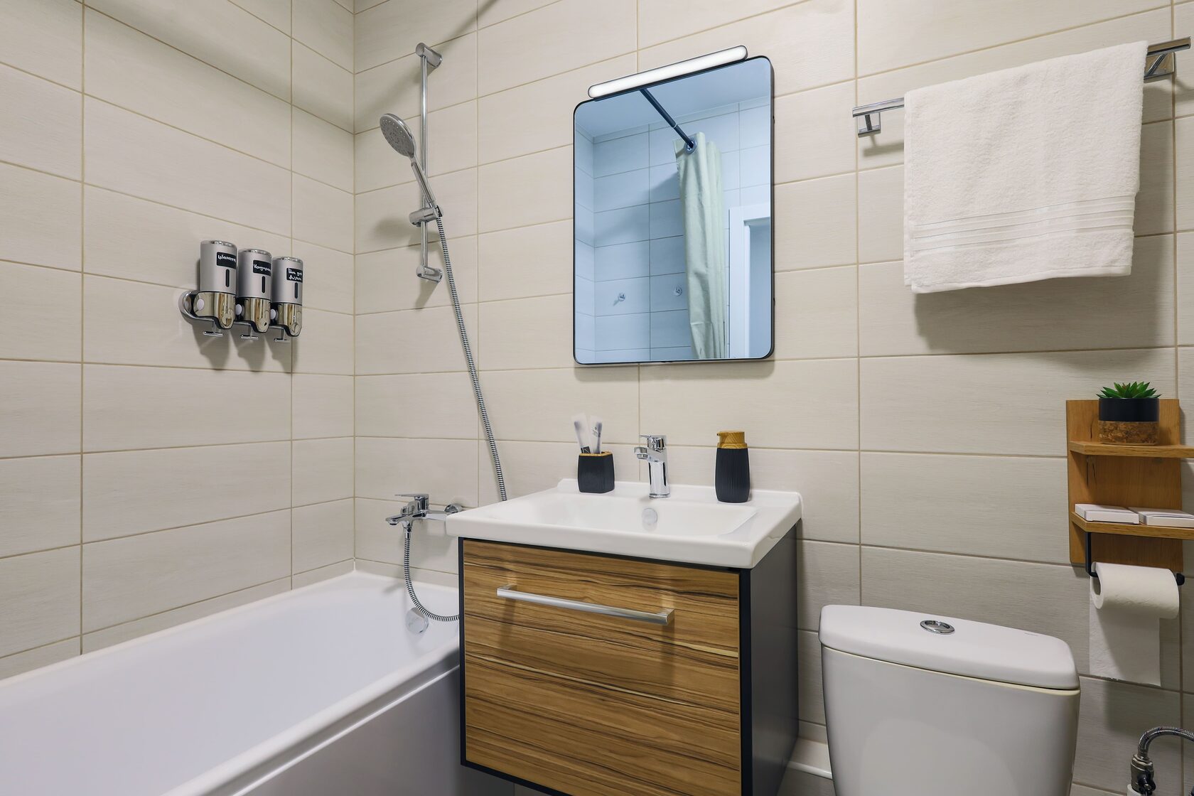 Отдельная ванная комната. Стиральная машина, фен и водонагреватель. На каждого гостя предоставляются полотенца и средства гигиены.