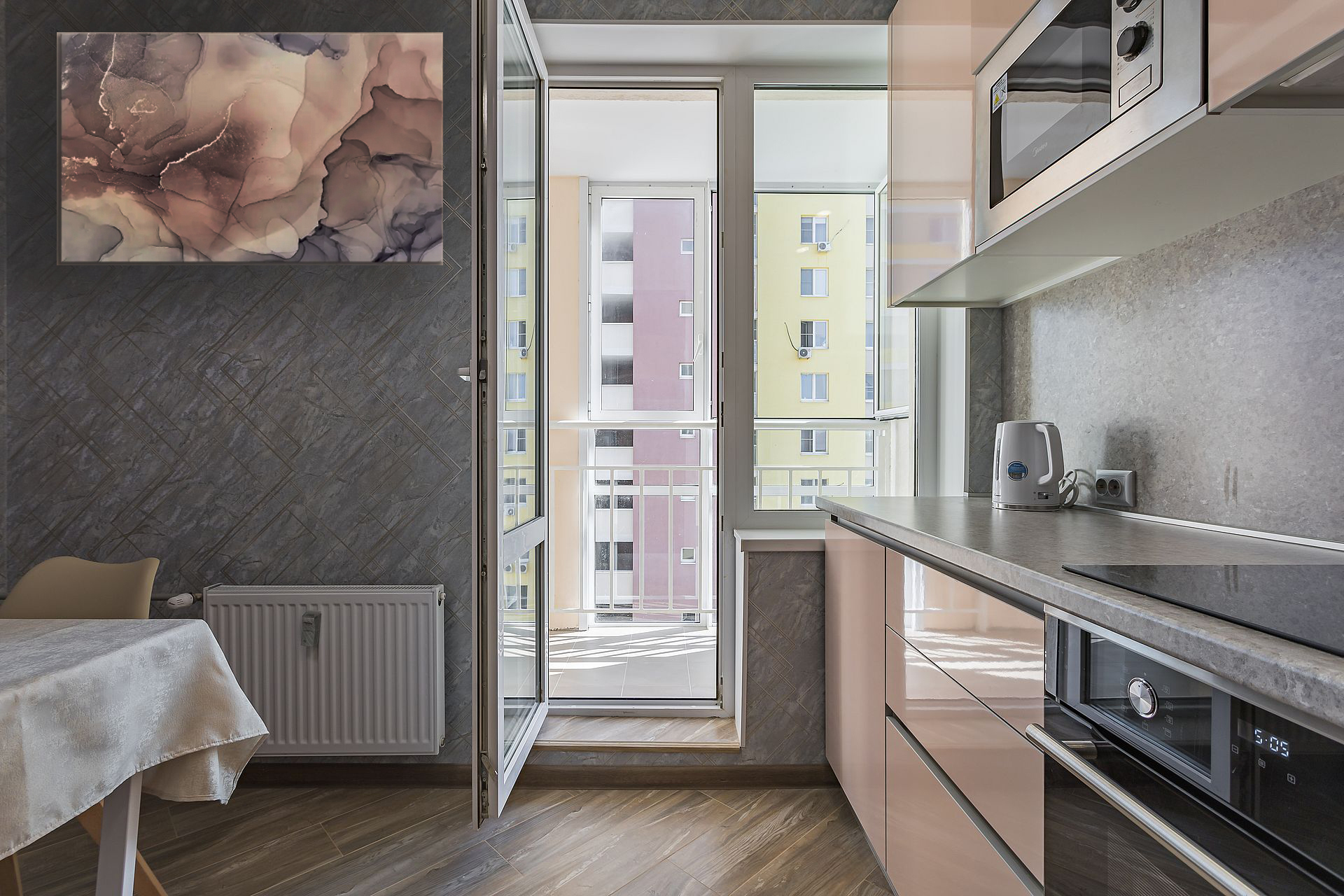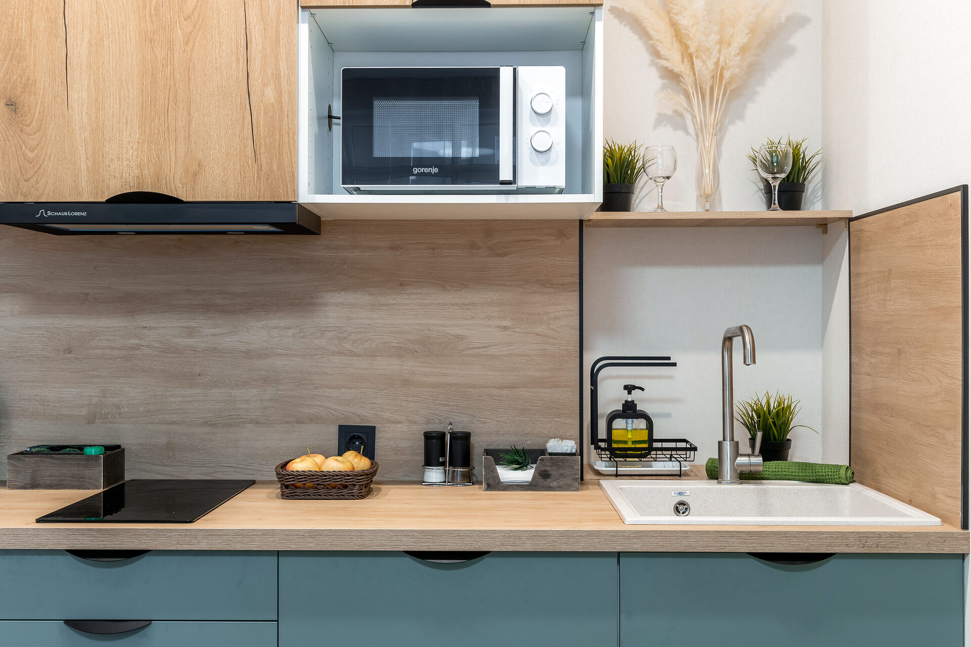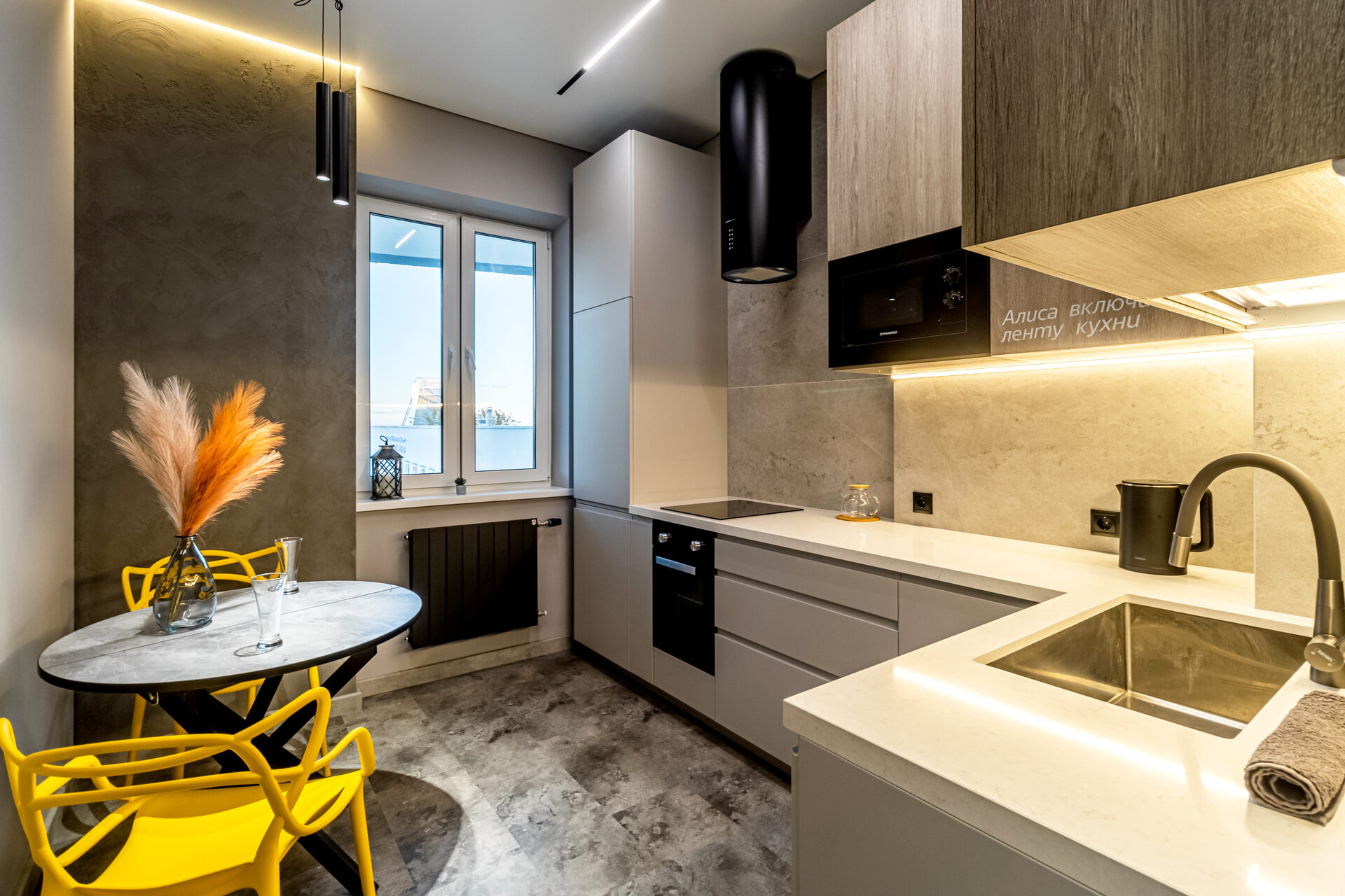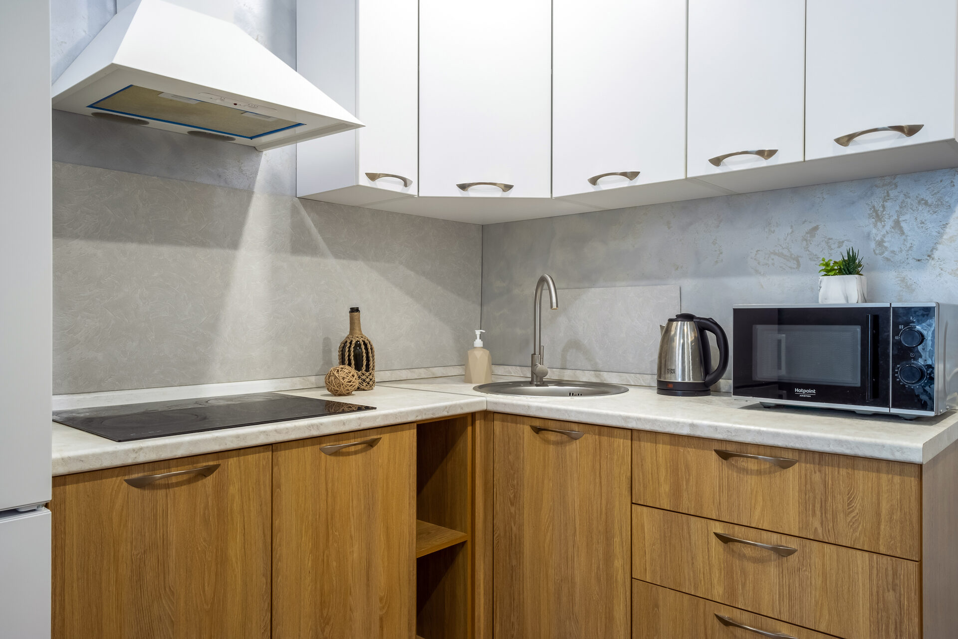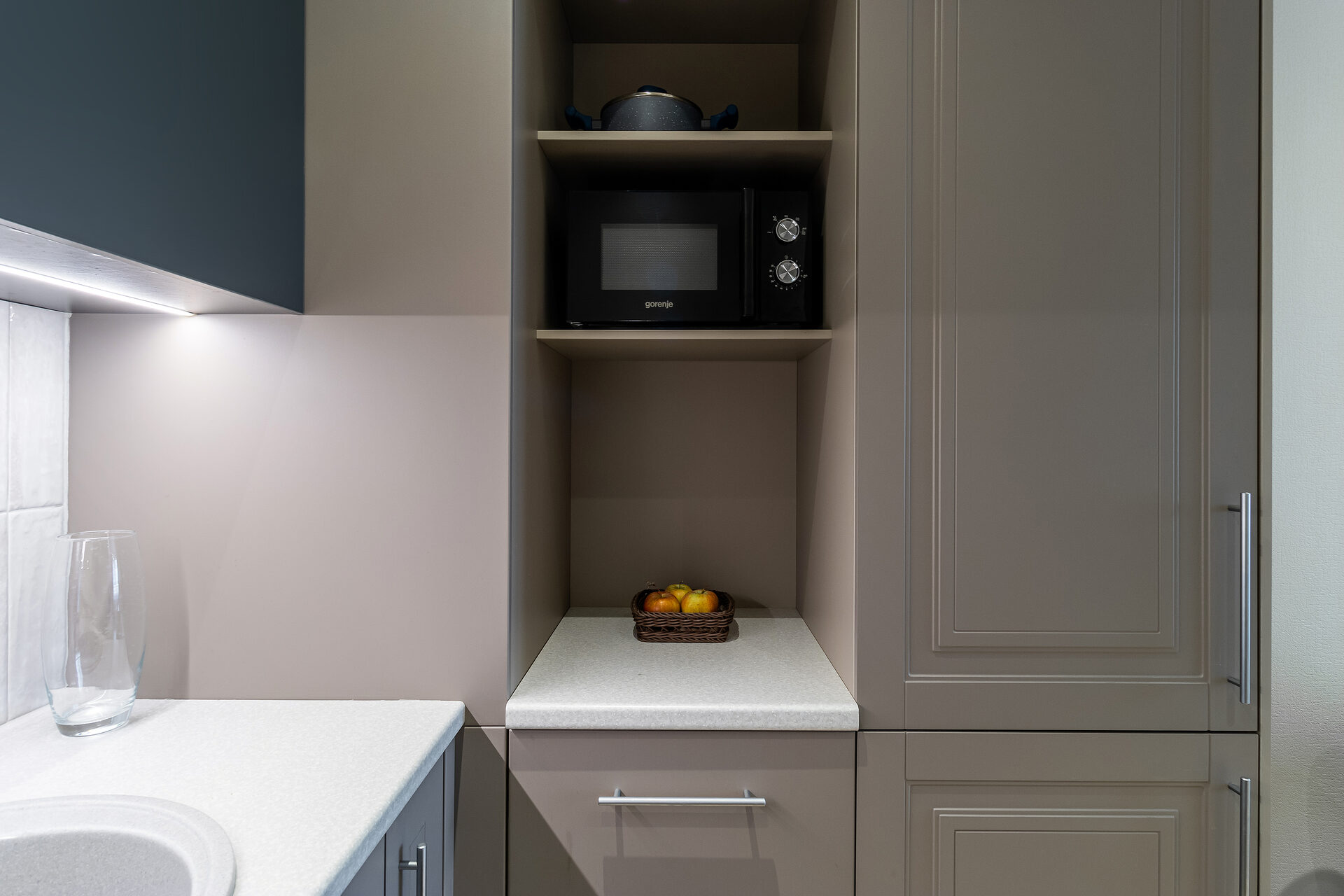 Полностью оборудованная кухня с встроенной техникой(холодильник, индукционная плита, СВЧ-печь, чайник, фильтр-кувшин для воды, набор посуды)
