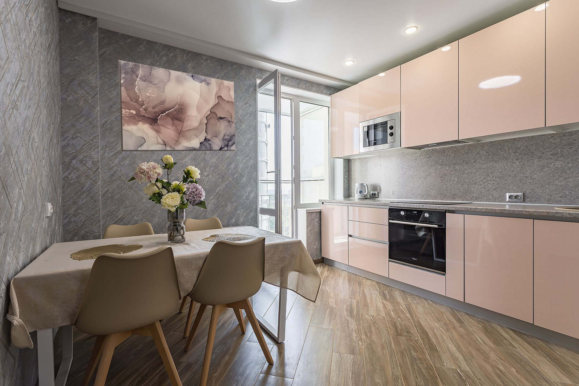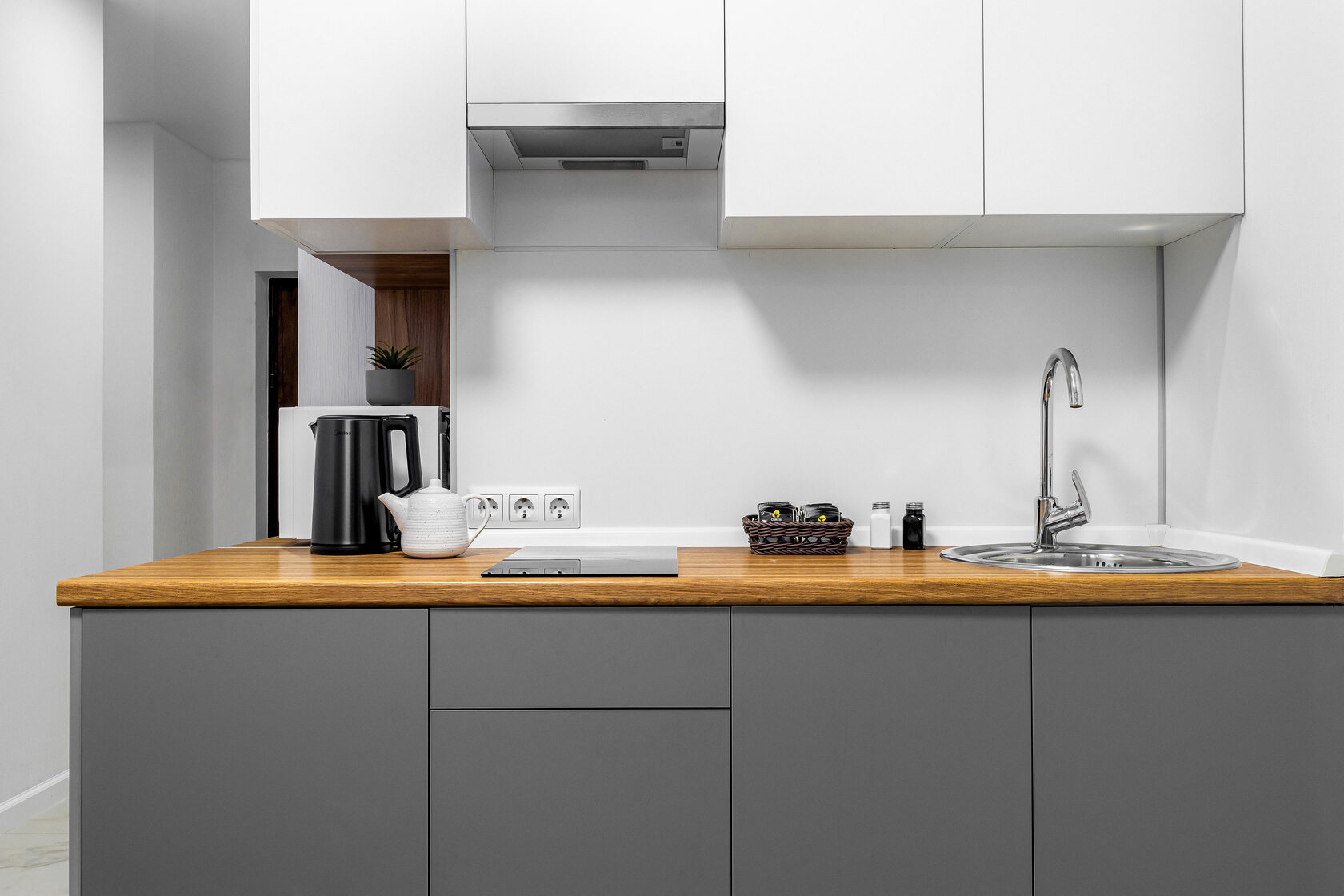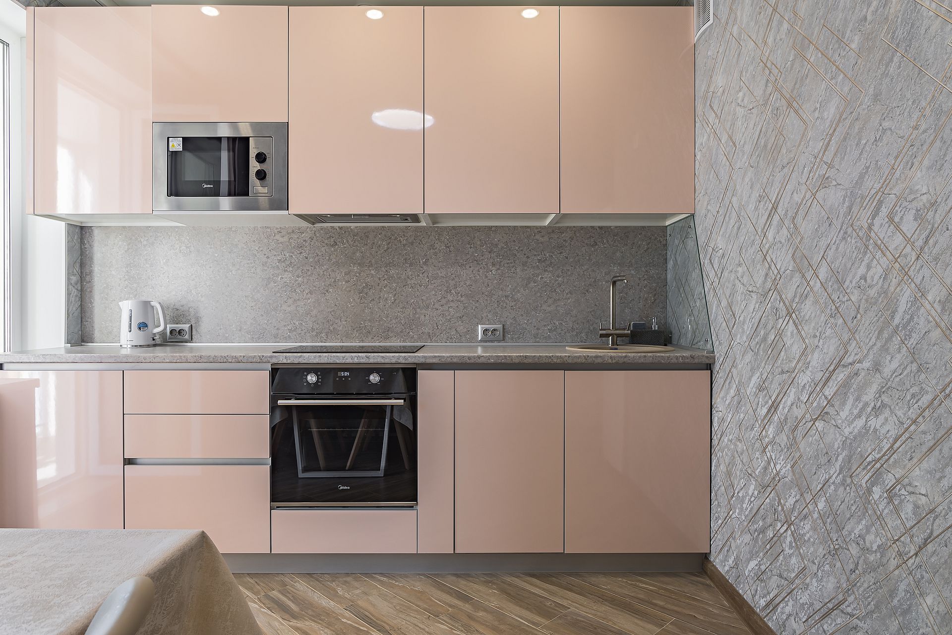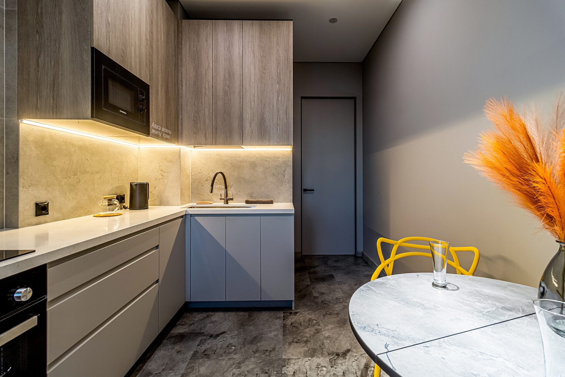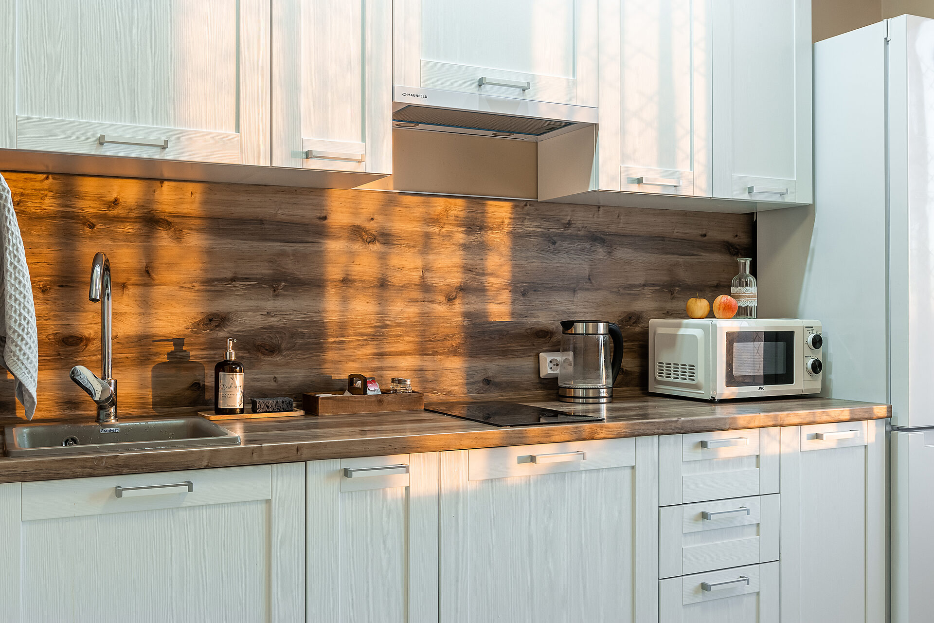 Полностью оборудованная кухня с встроенной техникой(холодильник, индукционная плита, СВЧ-печь, чайник, фильтр-кувшин для воды, набор посуды)