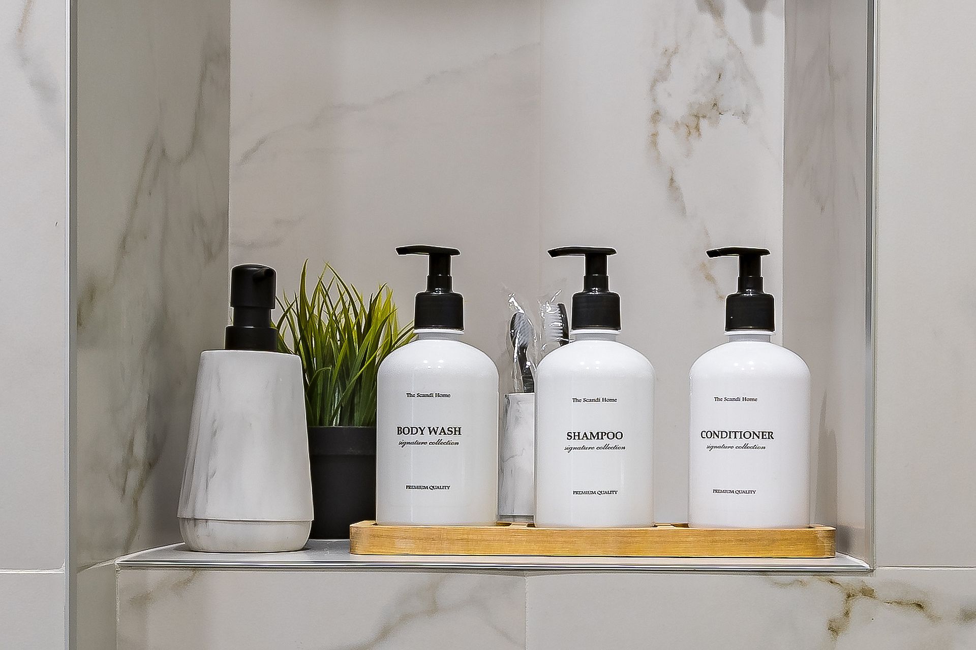 Гигиенические принадлежности: мыло, шампунь, гель для душа, кондиционер для волос, средства для уборки