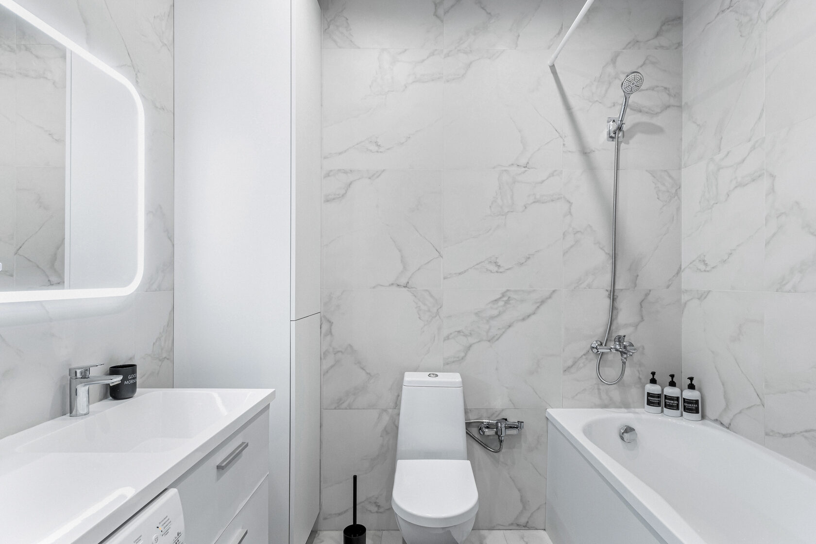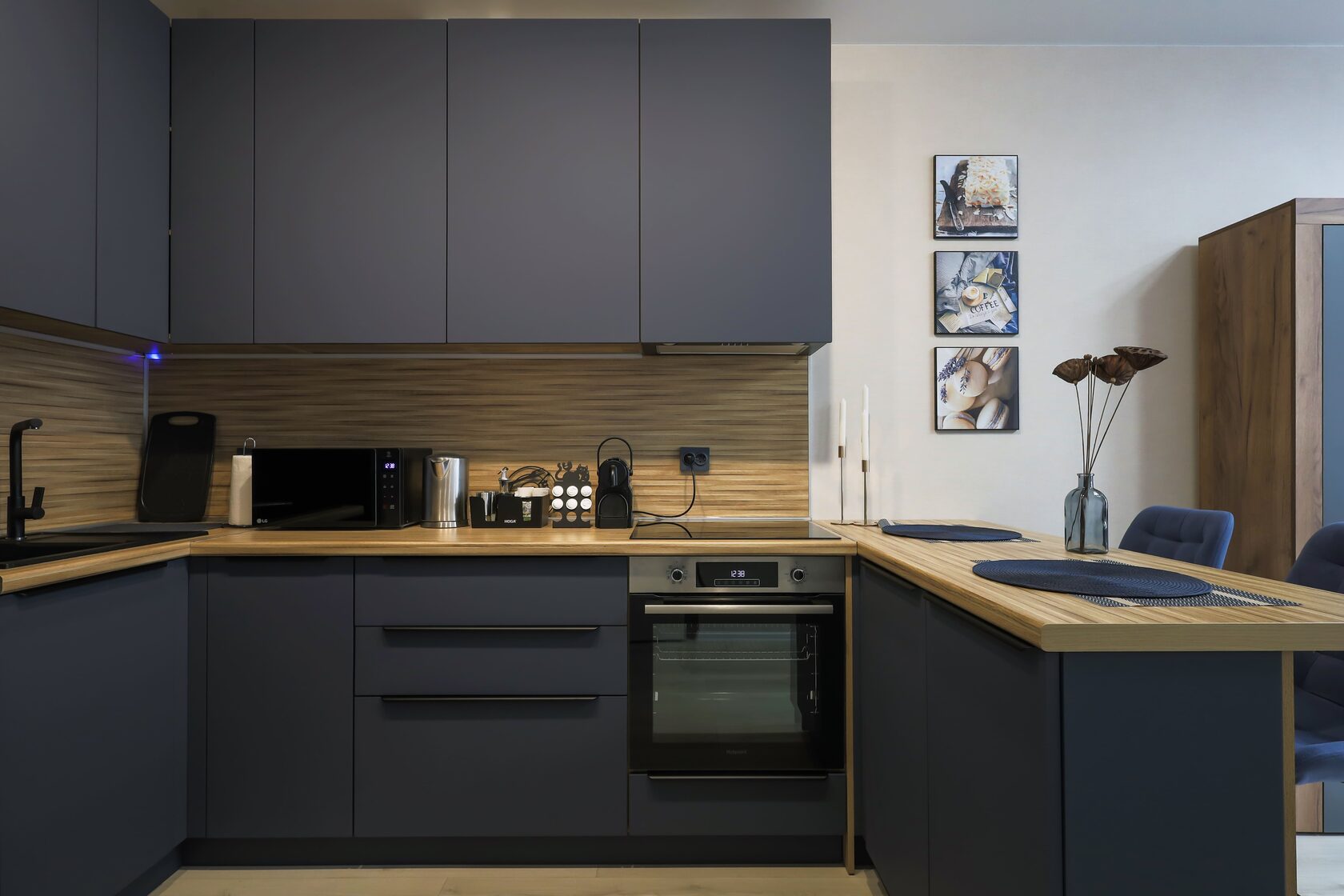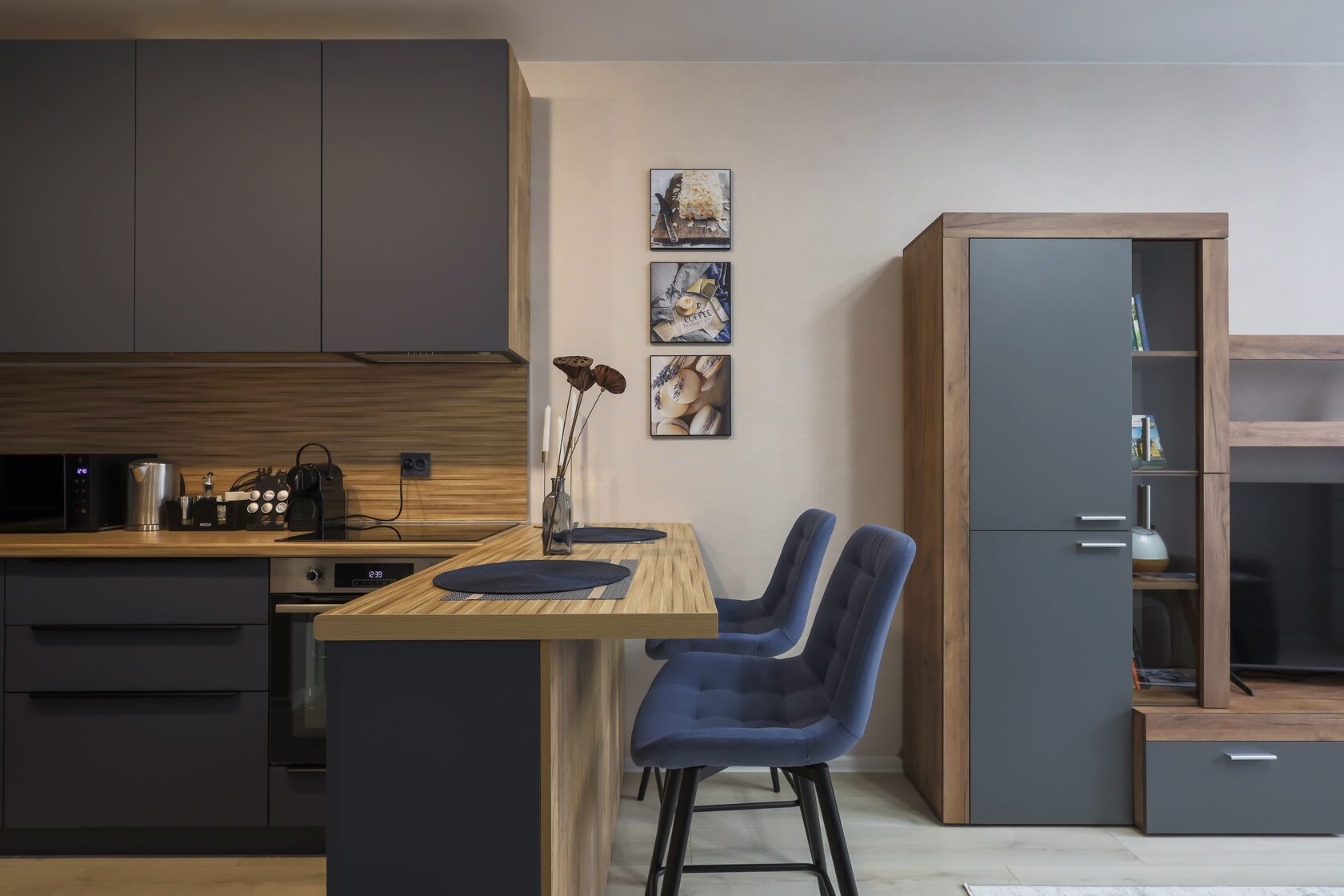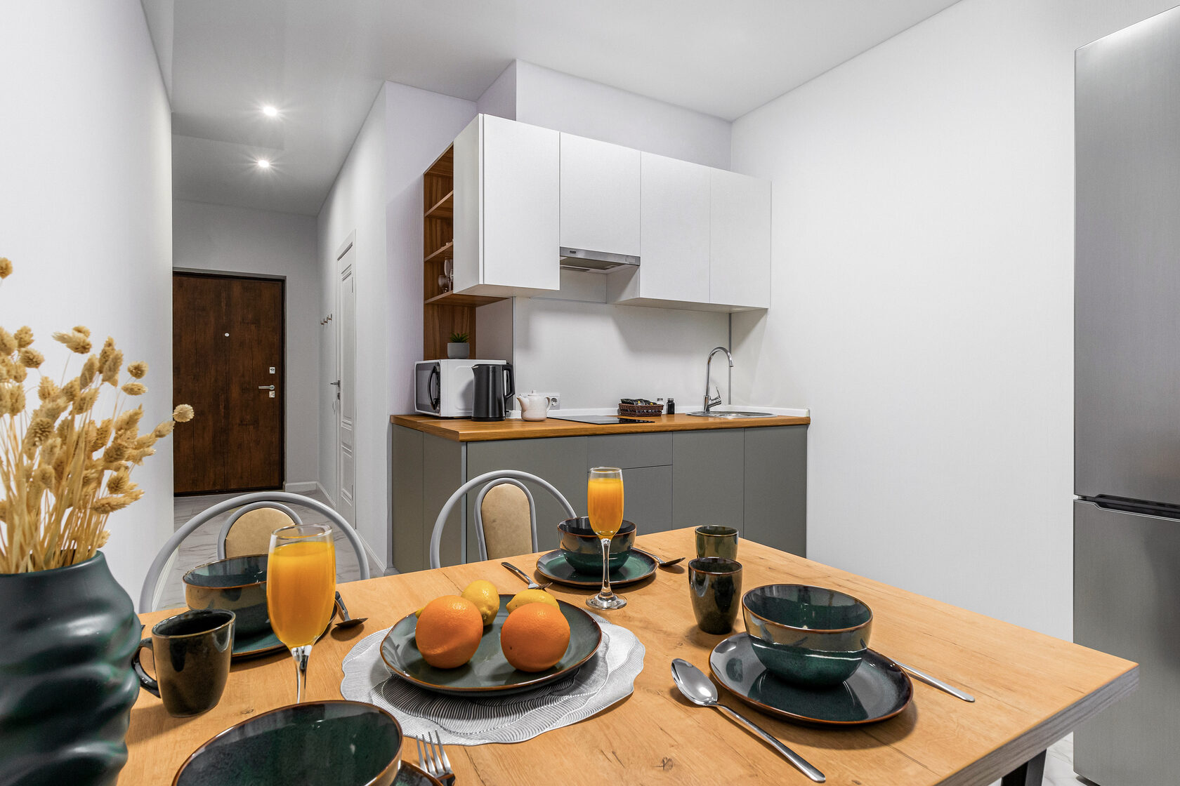 Полностью оборудованная кухня с встроенной техникой премиум-брендов (холодильник, индукционная плита, СВЧ-печь, чайник, фильтр-кувшин для воды, набор посуды)