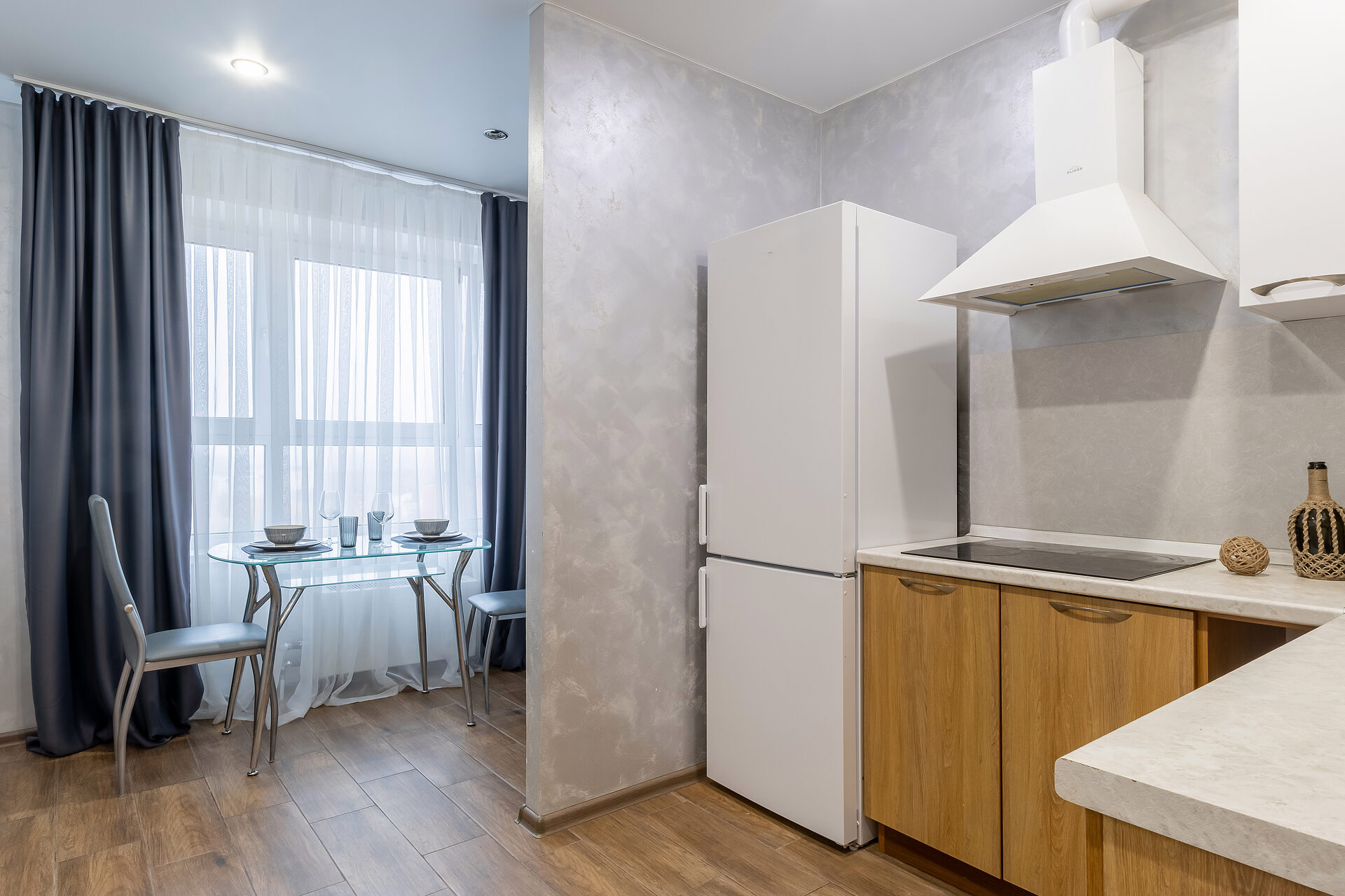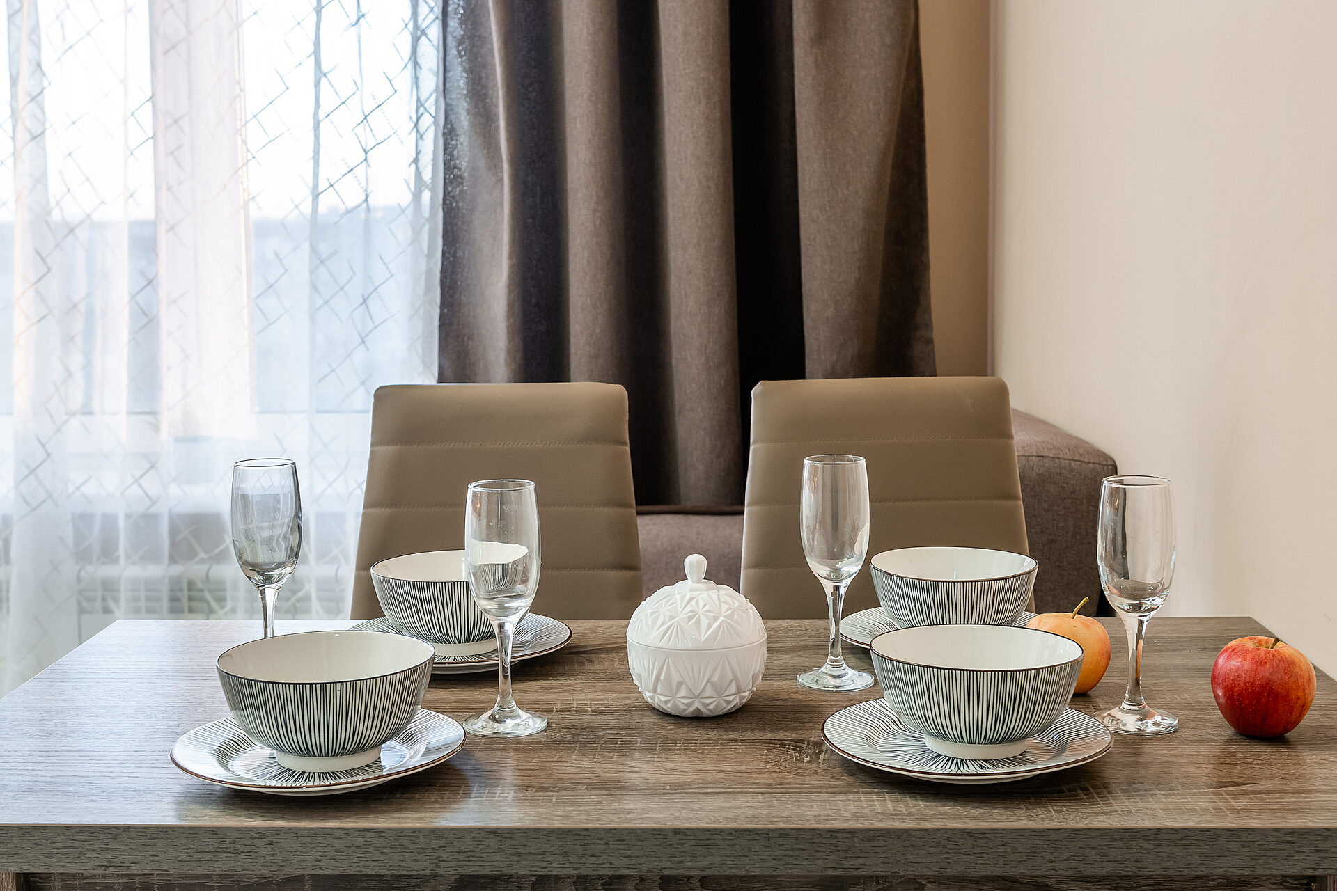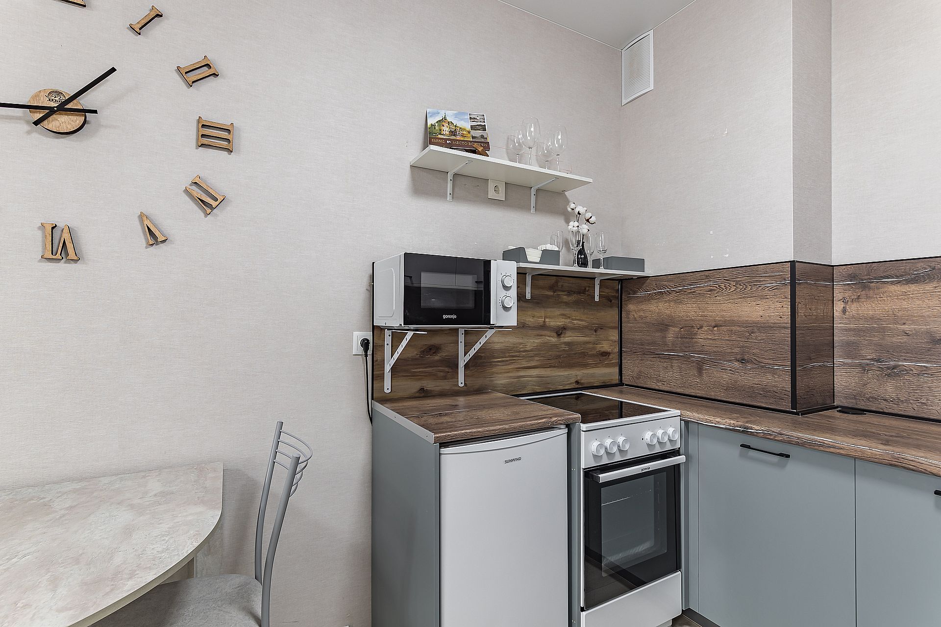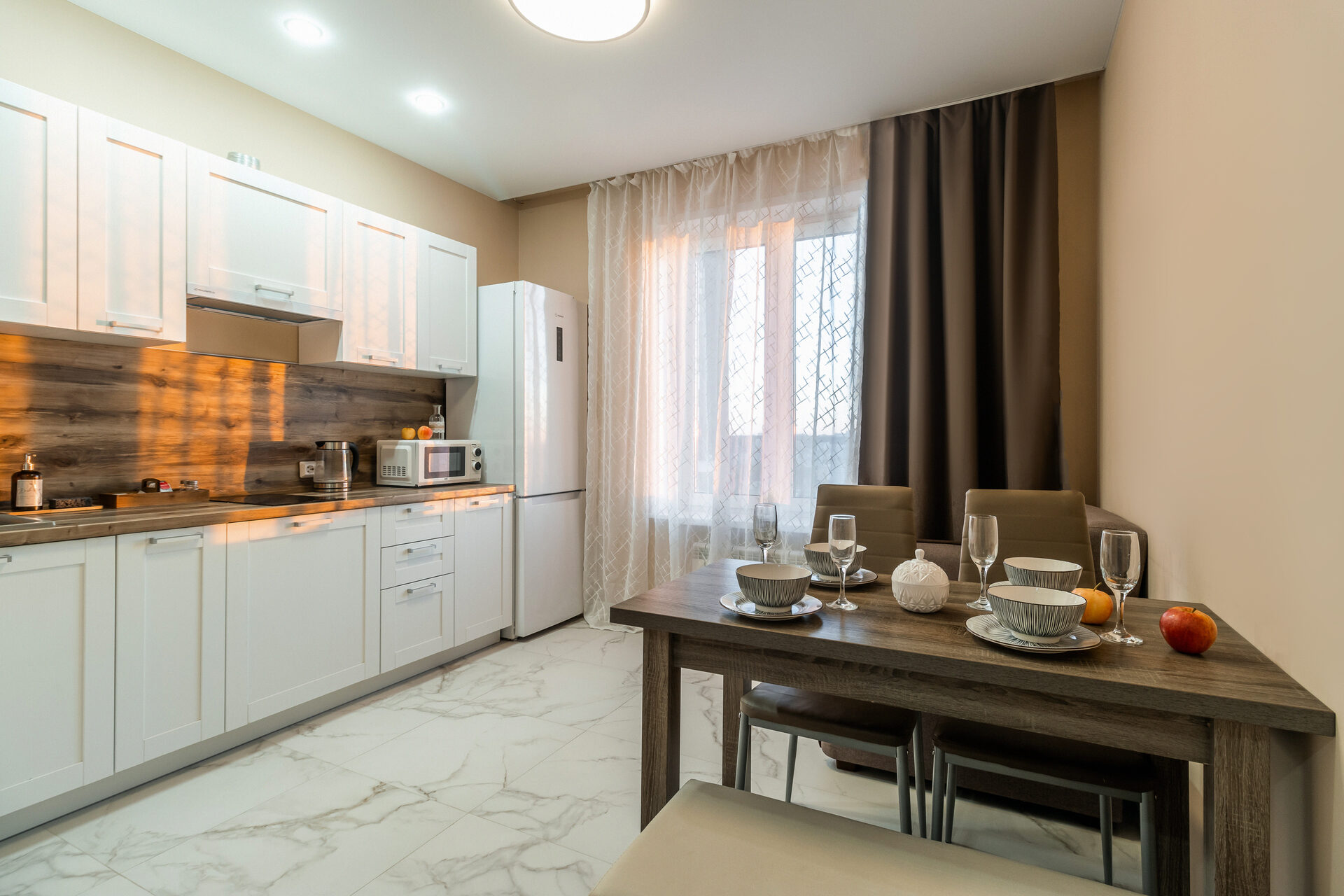 Полностью оборудованная кухня (холодильник, индукционная плита, духовой шка, СВЧ-печь, чайник, фильтр-кувшин для воды, набор посуды);