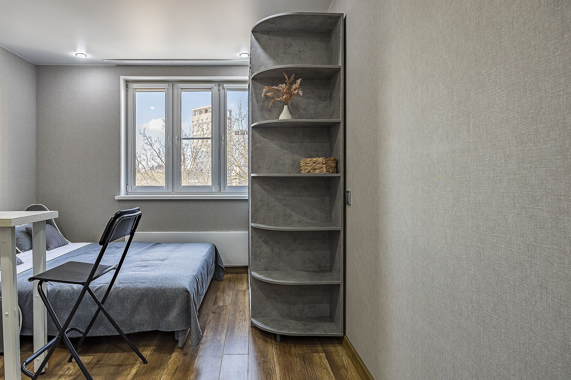Просторная студия (55 м²) с грамотным зонированием и панорамными окнами от пола до потолка, наполняющими пространство светом.