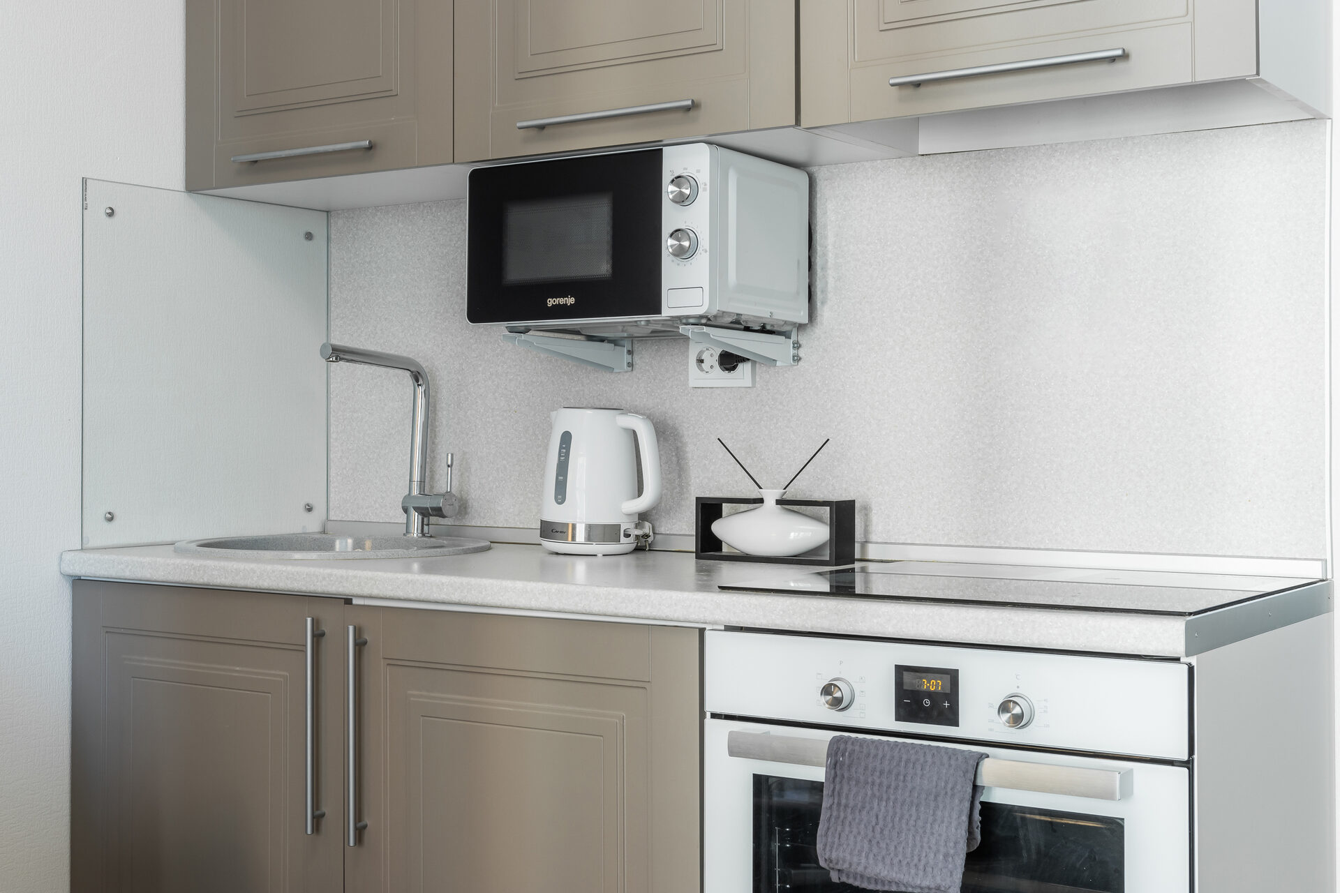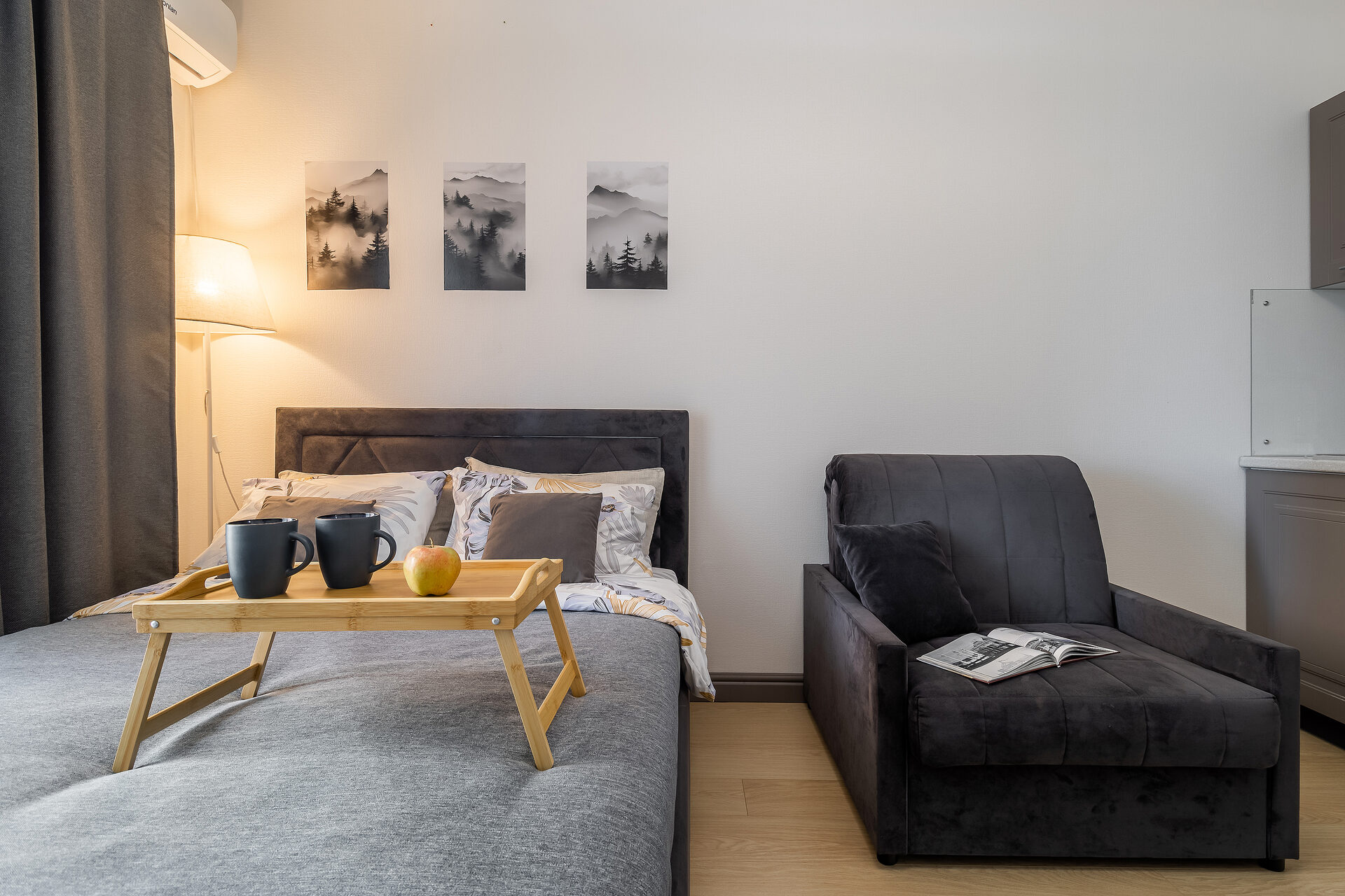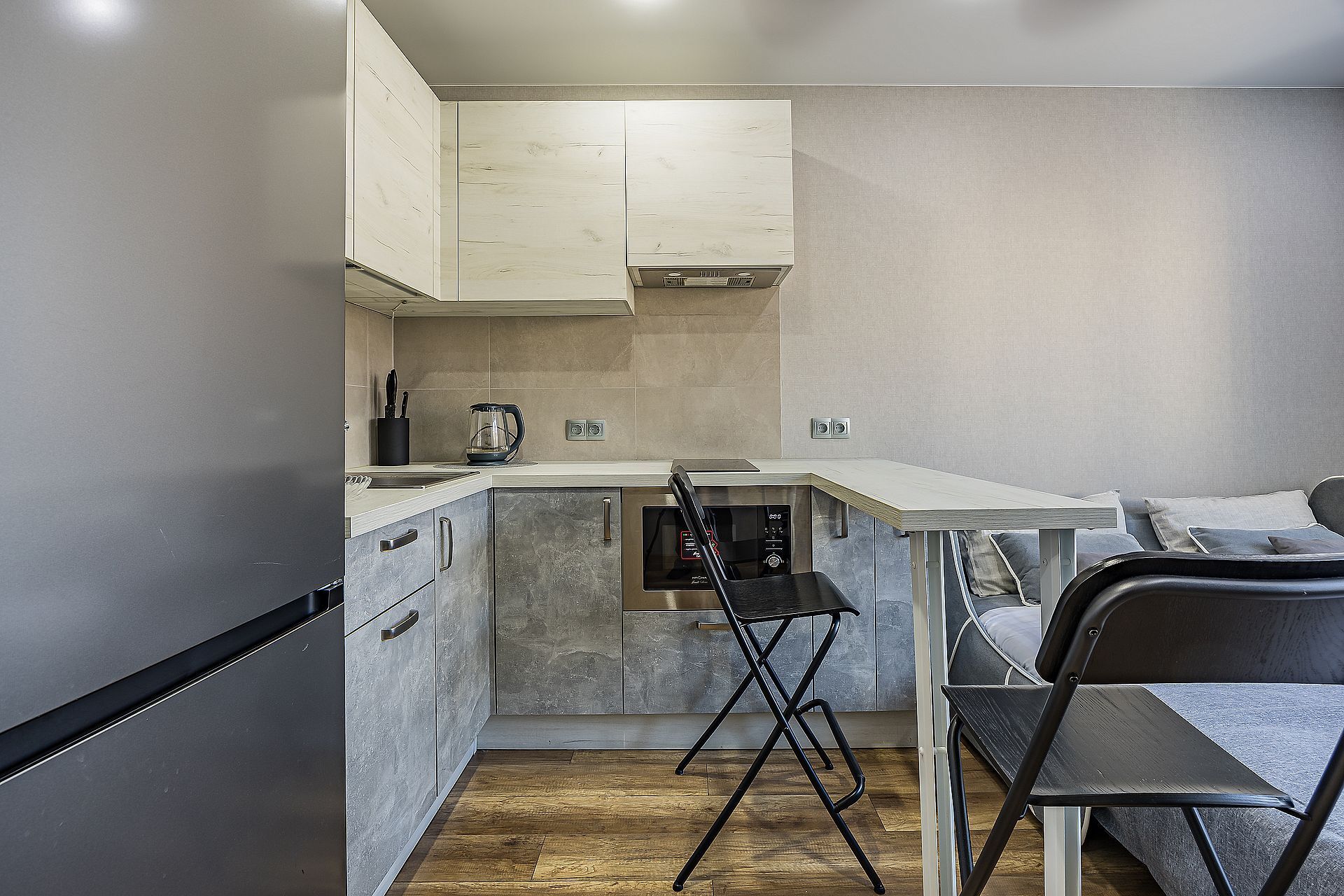 Полностью оборудованная кухня (холодильник, индукционная плита, СВЧ-печь, чайник, фильтр-кувшин для воды, набор посуды);
