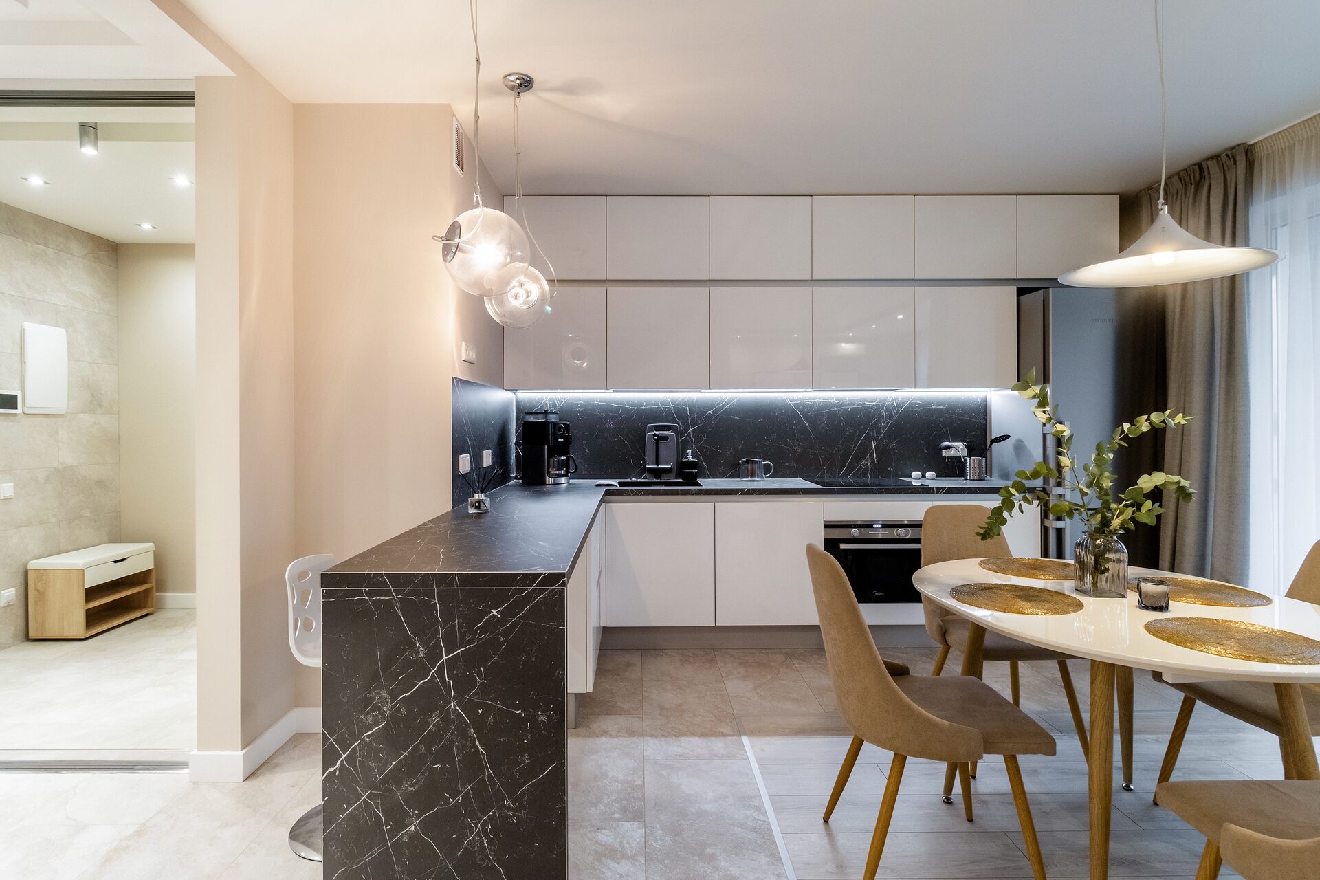 Полностью оборудованная кухня с встроенной техникой премиум-брендов (холодильник, посудомоечная машина, индукционная плита, духовой шкаф, СВЧ-печь, чайник, встроенный фильтр для воды, набор посуды, кофеварка, тостер)