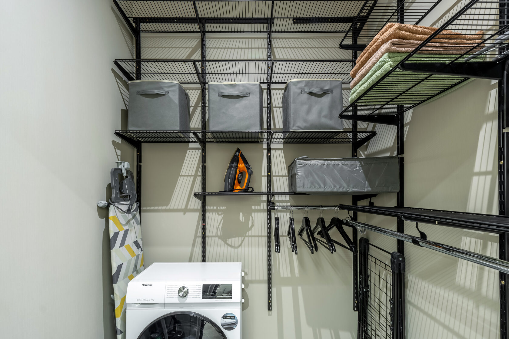 Стиральная машина, бойлер, утюг и гладильная доска.