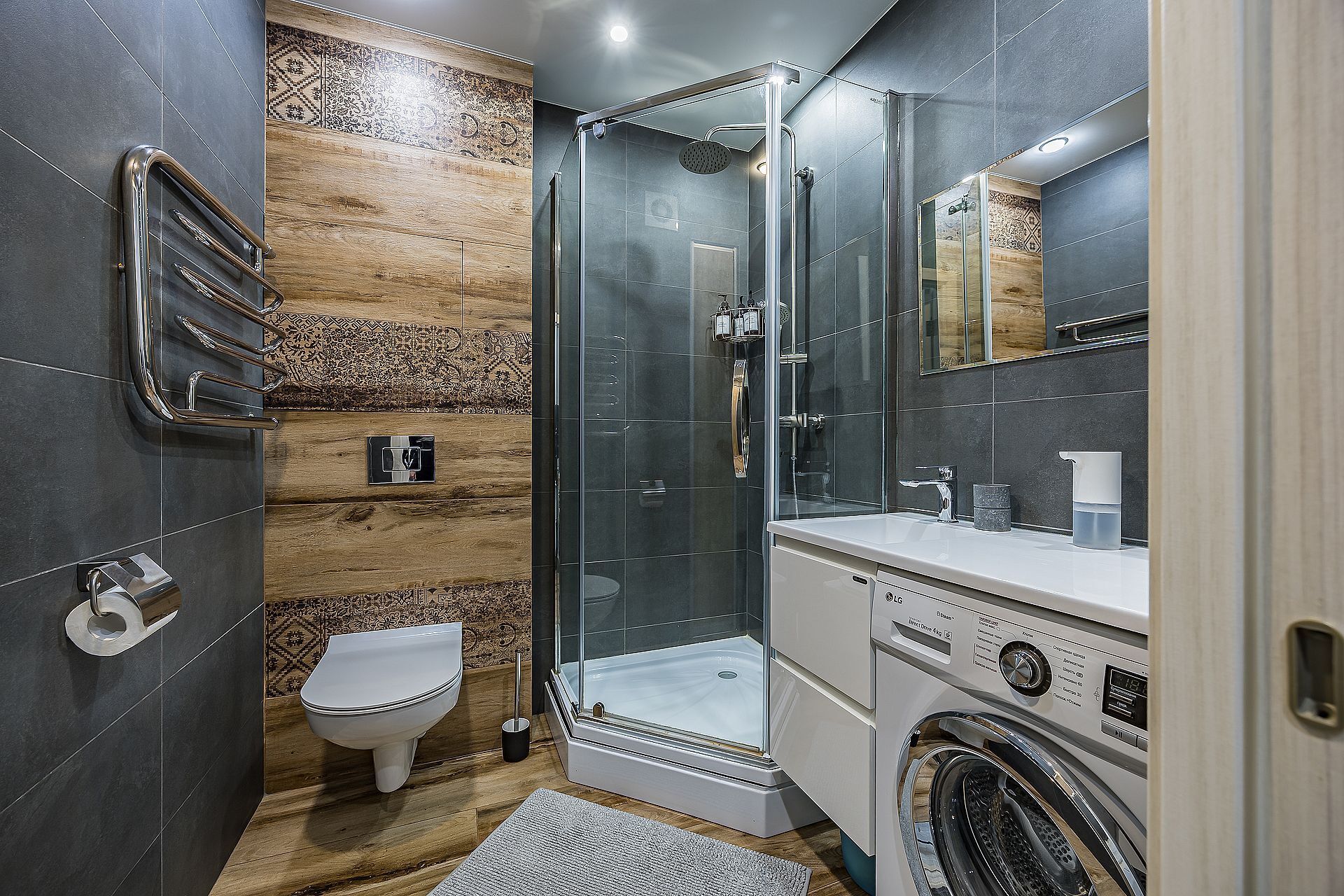 Ванная комната: душ с тропической лейкой и просторная душевая кабина, полы с подогревом. Стиральная машина, фен и бойлер. На каждого гостя предоставляются полотенца и средства гигиены.
